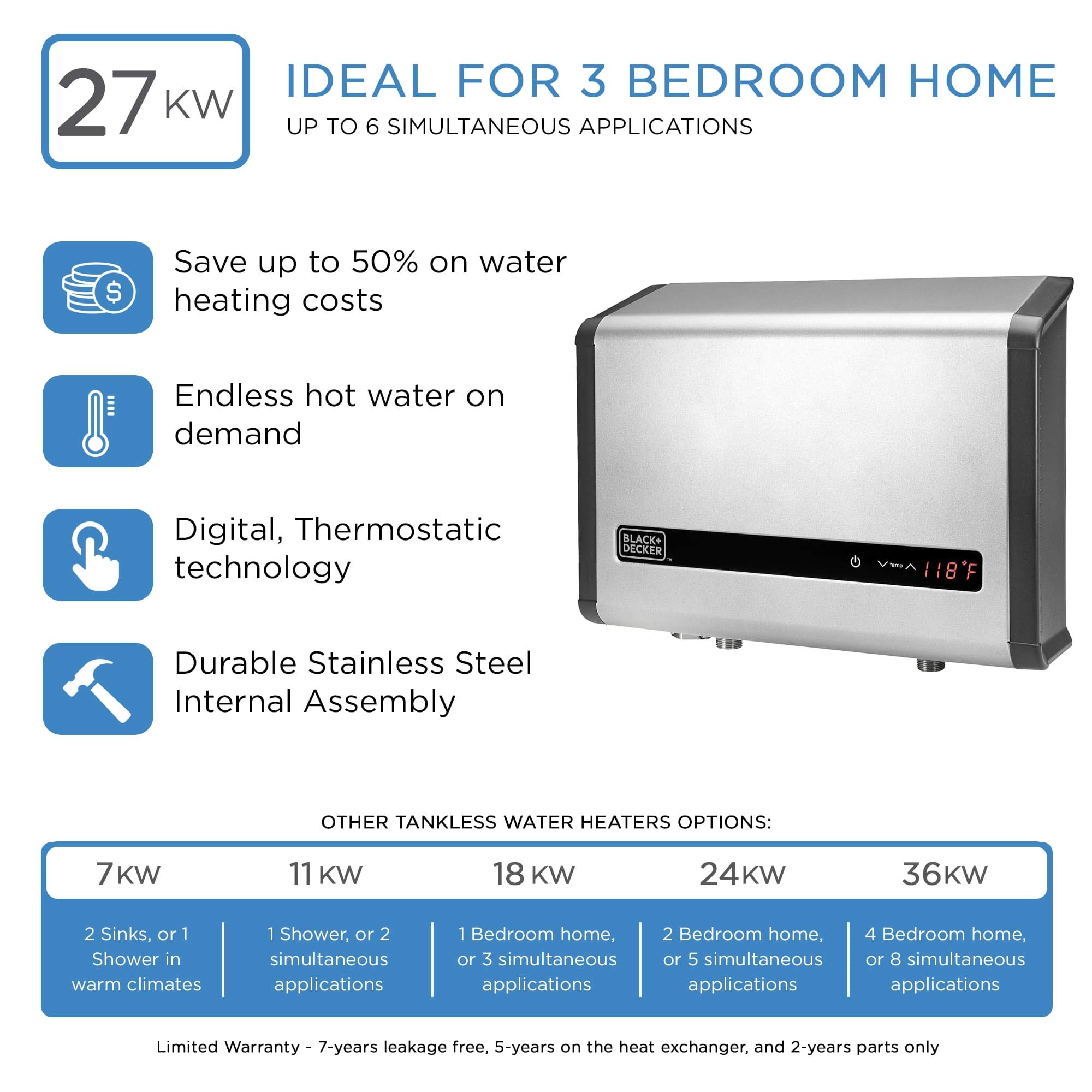 Black Decker Tankless Electric Water Heater 27kw 240 Volt 5 8gpm Self Modulating Multi Application Unit For Whole House Hot Water On Demand Digital Temperature Display Amazon Com